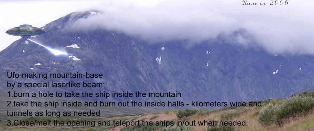 I de norske fjell-områder er det enorme fjellmassiver som "de" har benyttet som baser i århundrer/- årtusener - slik som i bl a Hessdalsområdet og over mot Oppdal, samt ellers i fjellomr i Norden og ellers i verden. Prossessen med å lage en underjordisk base er ganske "enkel" når man råder over den high-tech som disse har. I matr fra UMMO-kontaktene som skjedde først på 50tallet,beskrives hvordan de med "sten-skjære/detmaterialiserings-stråler" allerede første dagen etter sin ankomst kunne skjære seg inn i fjell og lage en skjult base. Dette skapte litt røk-utvikling og en tid var de redd at landsbyen i nærheten skulle oppdage dem pga av denne røkutvikling.