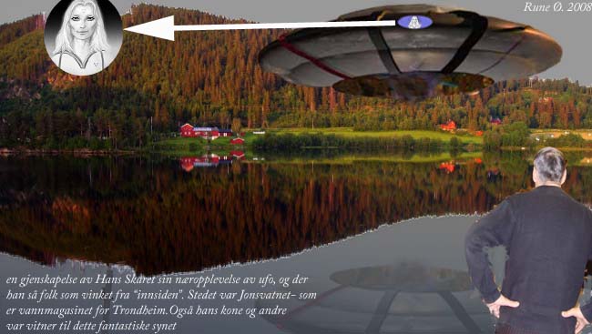 under Alternativmessa i Trondhjem i april 2008 fortalte Hans Skaret og hans kone - se bildet under, om en spektakulær ufo-nærobservasjon over Jonsvatnet ved Trondhjem, og det var også en annen "vanligvis så tøff kar" som også så dette. Og han sistnevnte ble vist redd - på godt trødersk "var skremt ja" - som Trond Kirkevåg lagde gjøn på. Og den VAR virkelig så nær at de så tydelig "skygger som beveget seg" i et vindu på skipet!! Det var vel dette som ble litt for tøfft for et av vitnene. Det var altså ikke et tydelig "menneske" de så, slik bildet her antyder, men dog bevegelses-skygger i vinduet!