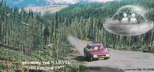 Denne nær-obs. skjedde sist i aug.1977 ved Narvik og Anita Abelsen og daværende mann var på vei i deres bil mellom kl 21 og kl 22 - da fartøyet kom glidende ned langs skogen og parkerte seg der med to mennesker inni, som de i korte øyeblikk hadde direkte øyenkontakt med!! Disse "piloter" hadde store hoder og også store øyne. I sin korte obs.rapport har AA skrevet at fartøyet var gjennomsiktig - klart glass, og hun også laget en skisse som bildene under er skapt ut fra. Vet ikke med sikkerhet om hun mener at kun øvre delen var gjennomsiktig, eller om hele "saken" var det..... I alle fall hørtes ingen lyd under møtet som skjedde ved at de stoppet bilen og forbløffet kikket på de to i denne merkelige farkost. Den forsvant etter kort tid tilbake oppover lia over skogen og til himmels....